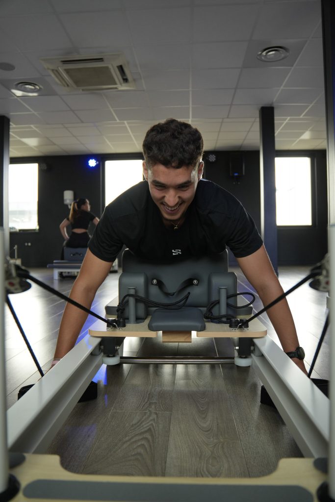 Tu montes sur la machine Reformer, ajustes la résistance via les ressorts…