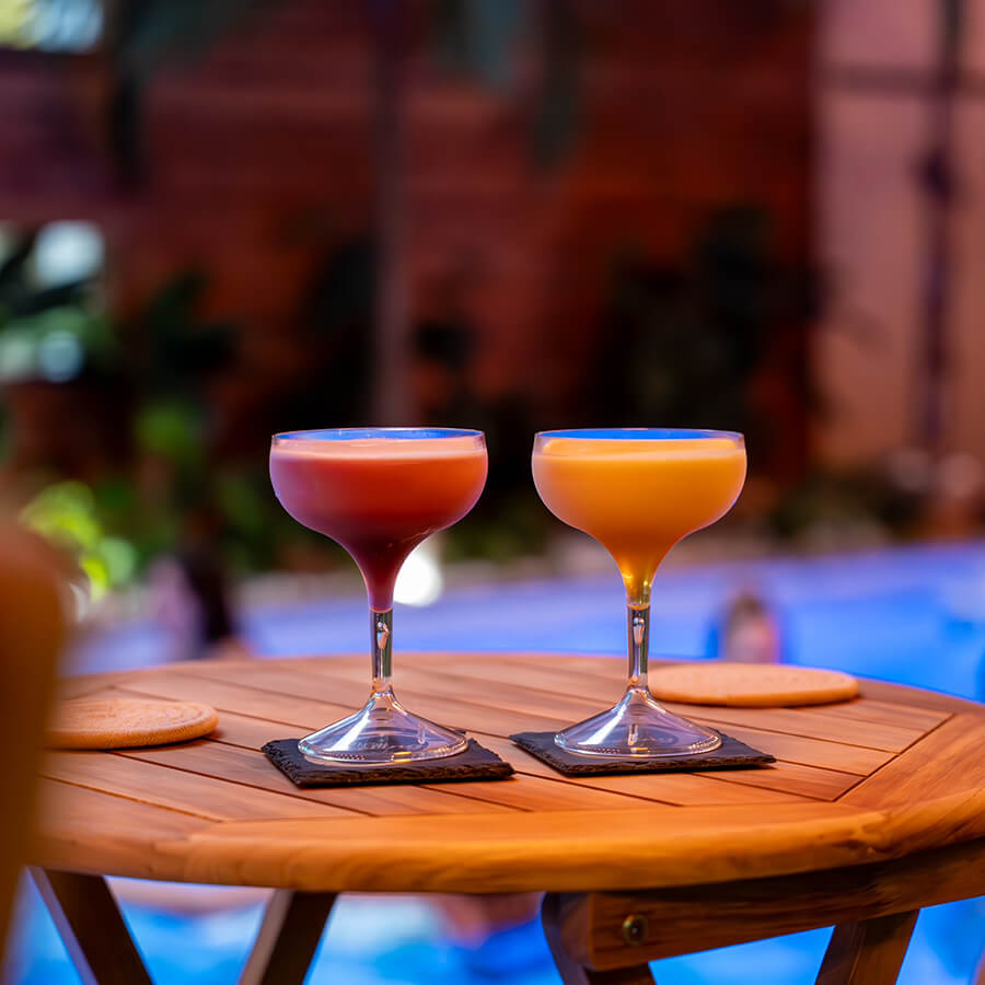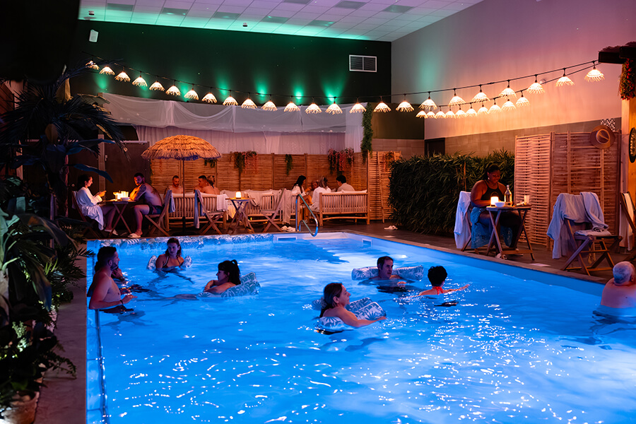 Au milieu de tout ça, un bar lounge attend ceux qui veulent faire une pause. Cocktails, boissons fraîches, petites planches, moments partagés… tout est pensé pour t’offrir un vrai instant de respiration. Tu peux boire un verre avec ou sans alcool, grignoter quelque chose, discuter avec ta moitié ou tes amis, puis retourner dans la piscine, au sauna ou au spa. Ce va-et-vient libre crée une expérience beaucoup plus vivante que dans un spa classique.