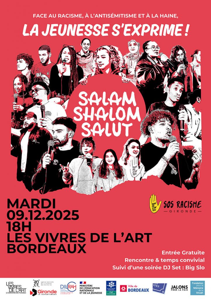 Ces dernières années, le climat en France s’est durci : crimes racistes, poussée de l’extrême droite, banalisation des propos de haine, montée des actes antisémites après le 7 octobre 2023. Face à cette ambiance pesante, Salam Shalom Salut, portée par SOS Racisme, arrive avec une idée simple mais puissante : remettre du lien là où la peur et la suspicion gagnent du terrain. La tournée en Gironde veut redonner de la voix à celles et ceux qui refusent de choisir entre la lutte contre le racisme et celle contre l’antisémitisme, et qui pensent encore que notre société ne se résume pas à des blocs qui s’affrontent.